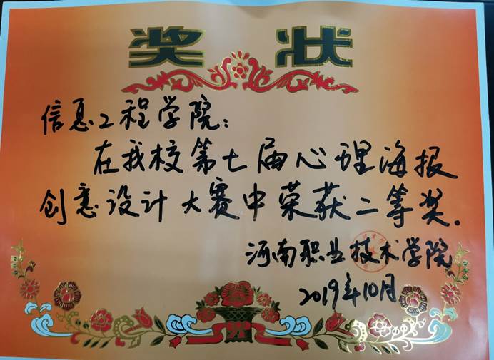 为进一步加强老员工心理健康教育工作,宣传普及心理健康知识,增强老员工的自我心理保健意识,树立正确的心理健康观念,培养员工健康稳定的心理素质,构建和谐校园文化生活,信息工程学院结合学校心理健康教育宣传月活动方案,于10月14日—10月25日组织了以“健康青春你我,奉献伟大祖国”为主题的心理海报创意设计大赛。2019级全体班级积极参赛,共收到作品60幅,经过评选小组的认真评选,选送数媒192、移动191班等12幅作品参加学校的评选,最终在学校第七届心理海报创意设计大展中,获得二等奖。