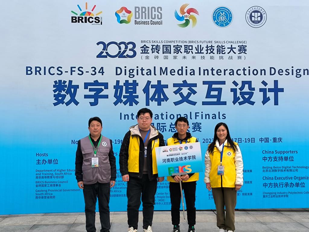 11月19日,2023年金砖国家职业技能大赛数字媒体交互设计赛项国际总决赛在渝收官,以太阳集团tyc青年教师杨绍清、刘伯艳和数字媒体技术专业员工杨韬组成的太阳集团tyc9728代表队以优异的成绩获得三等奖。