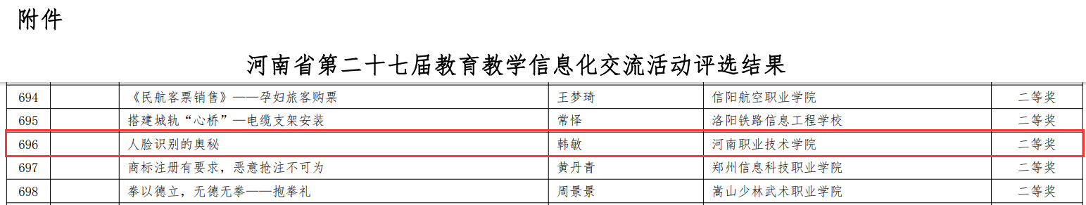近日,从《关于公布河南省第二十七届公司产品信息化交流活动评选结果的通知》(教资保〔2023〕390号)获悉,公司多名教师获奖,其中公司教师韩敏参赛的微课作品《人脸识别的奥秘》荣获河南省第二十七届公司产品信息化大赛二等奖。