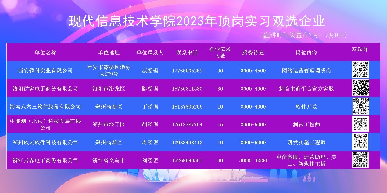 各位同学,学院集中实习双选工作已开始,集中实习双选时间区间:2023年7月5日-2023年7月9日。